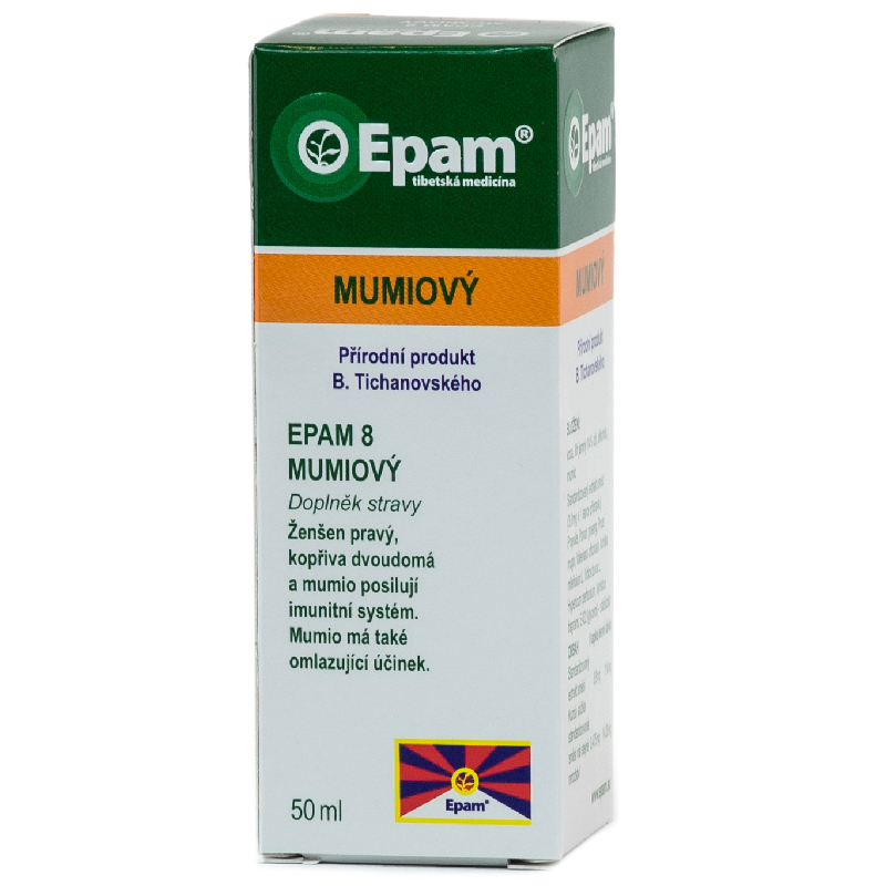 EPAM 8 – Mumiový obsahuje pečlivě vybranou směs devíti přírodních složek: mumio, propolis, kořen ženšenu pravého, pupeny borovice kleče, kořen kozlíku lékařského, květ řebříčku obecného, nať kopřivy dvoudomé, nať třezalky tečkované a muškátovník pravý (ořech). Tato kombinace je extrahována do vodně-alkoholického roztoku a stabilizována glycerolem, což zajišťuje maximální využití účinných látek.